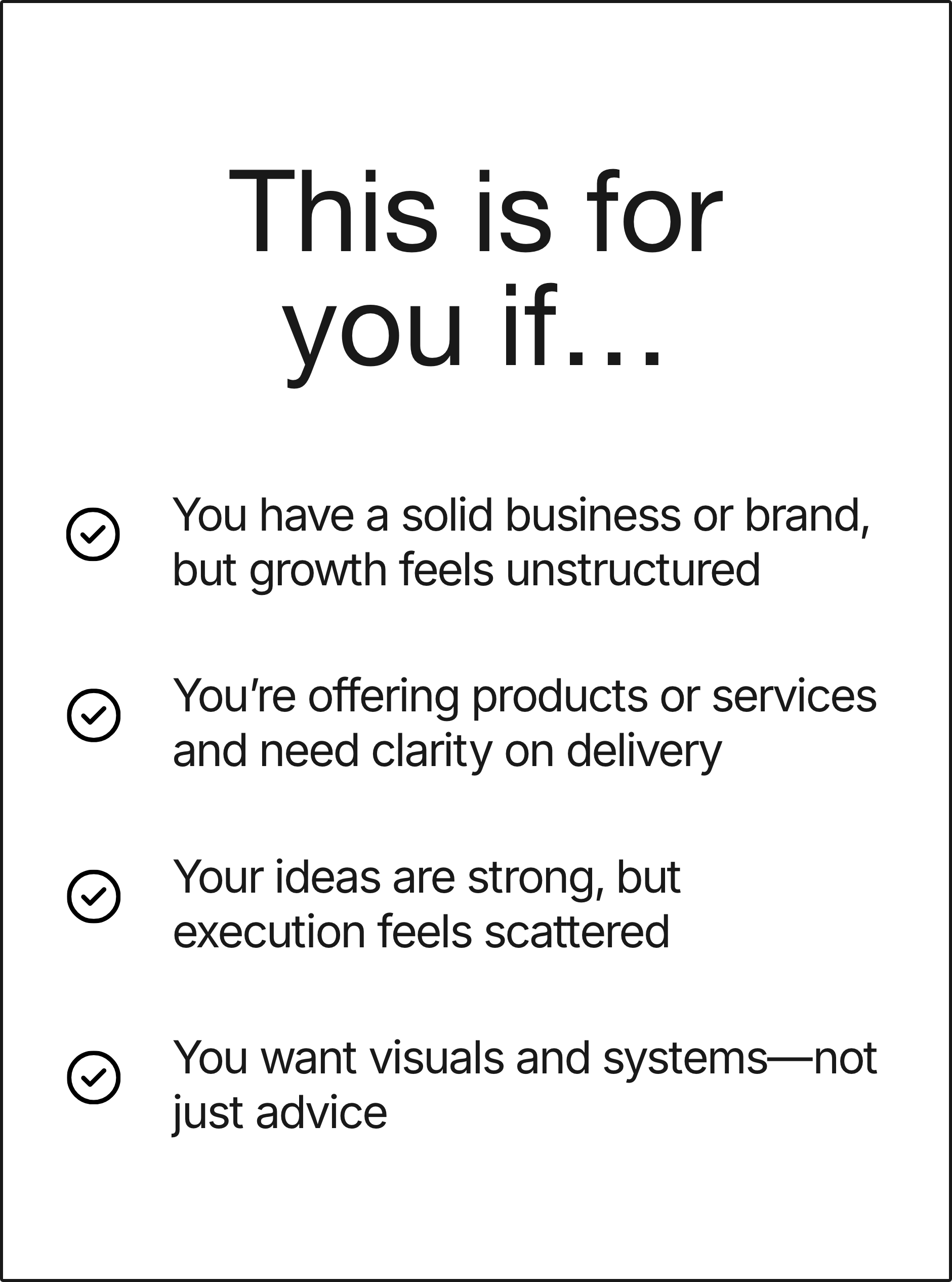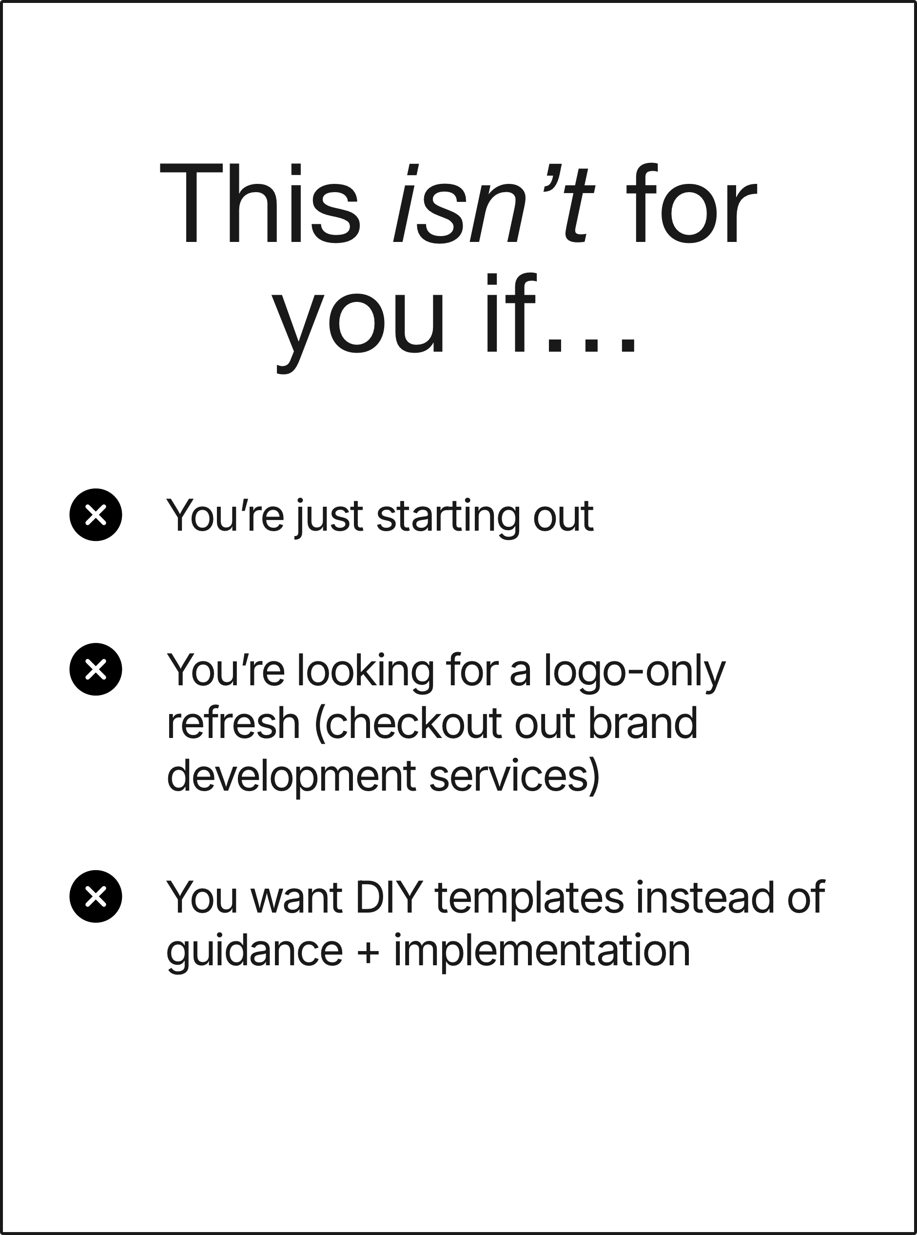 This is best for established or growing businesses that already have traction but need more structure, clarity, or alignment to support their next phase of growth. It’s not intended for early-stage startups or DIY branding.